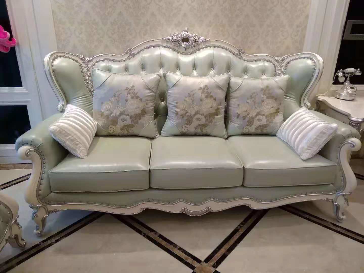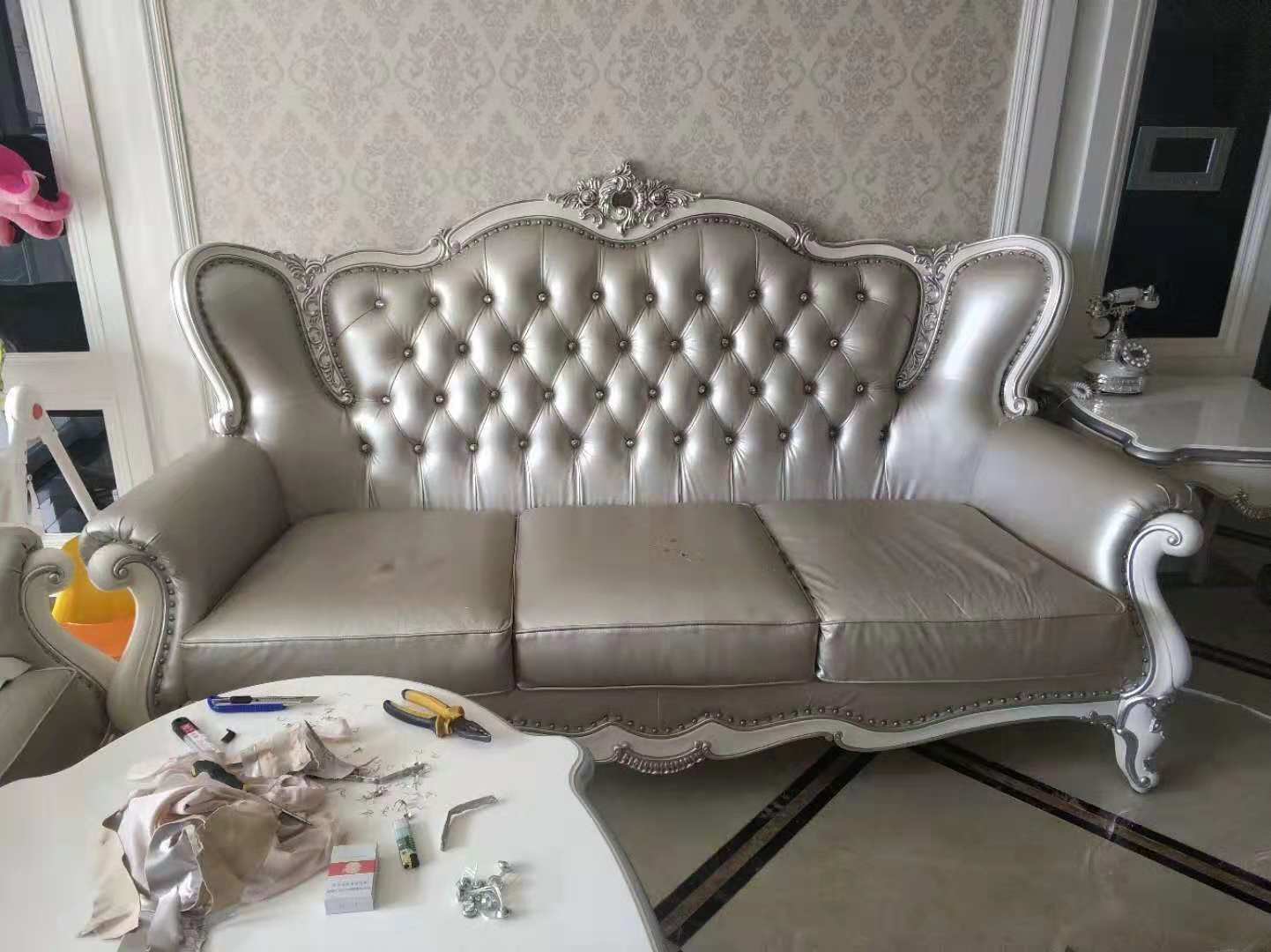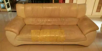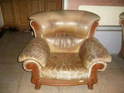 客户五年前购买的一套1+2+3沙发+1餐6桌椅,购买价14.6万,当初不懂材质,上当了,确实可惜,后来找到我们全套皮面换皮,接触面头层牛皮,非接触面仿皮,沙发坐垫全部更换高密度海绵,总价不到2万,皮新彩沙发翻新换皮热线:135 8595 6565