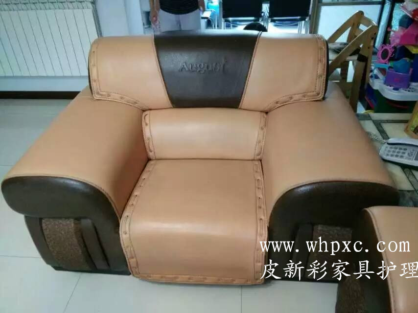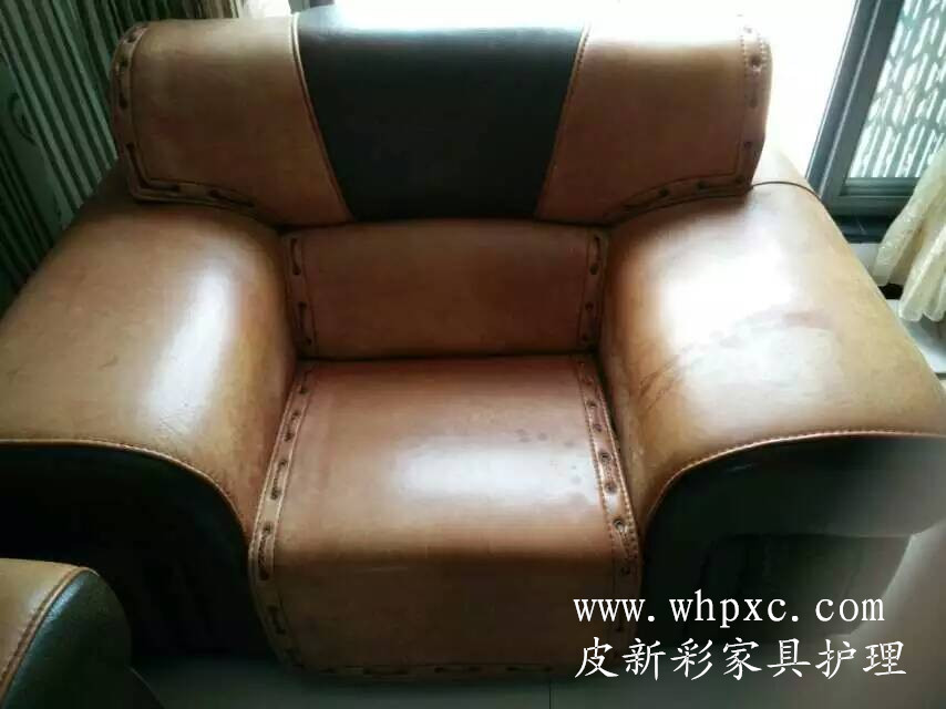 头层油蜡皮翻新上色,沙发用了5年,1+1+3沙发,价值3万元左右。出现变脏吸汗吸油,框架和海绵皮质都很好,有翻新价值,皮新彩给它做了全套做清洗上色翻新,费用1200元左右。皮新彩翻新电话135 8595 6565