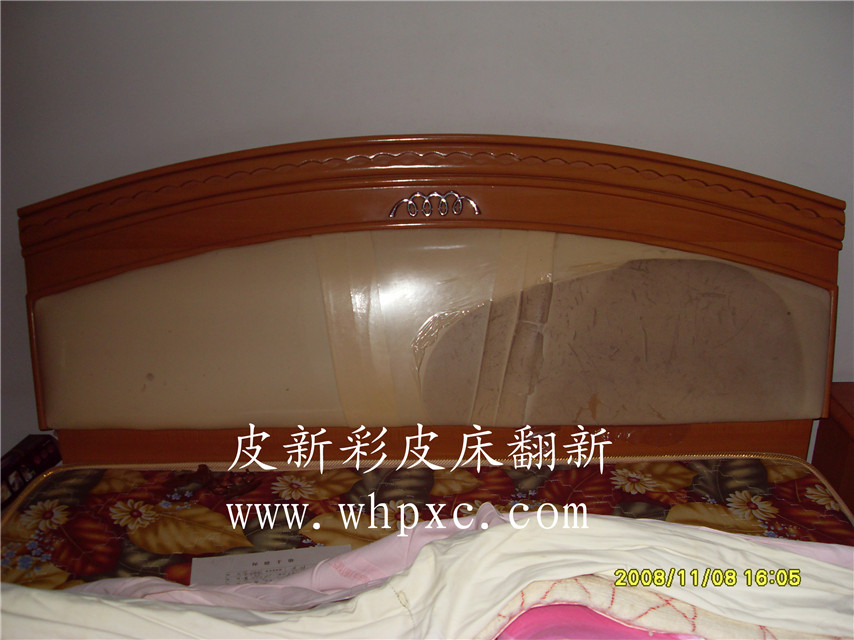 仿真皮欧式床头,两年后出现脱皮开裂,一般损坏的都是男同志的那一边,这种床有点麻烦要拆下来制版缝好,再包上去还要拉扣子,要是换好一点的仿皮包工包料大概1千左右,换真皮得2至3千元,武汉新彩美居专业从事沙发床头换皮翻新16年,咨询电话:13585956565