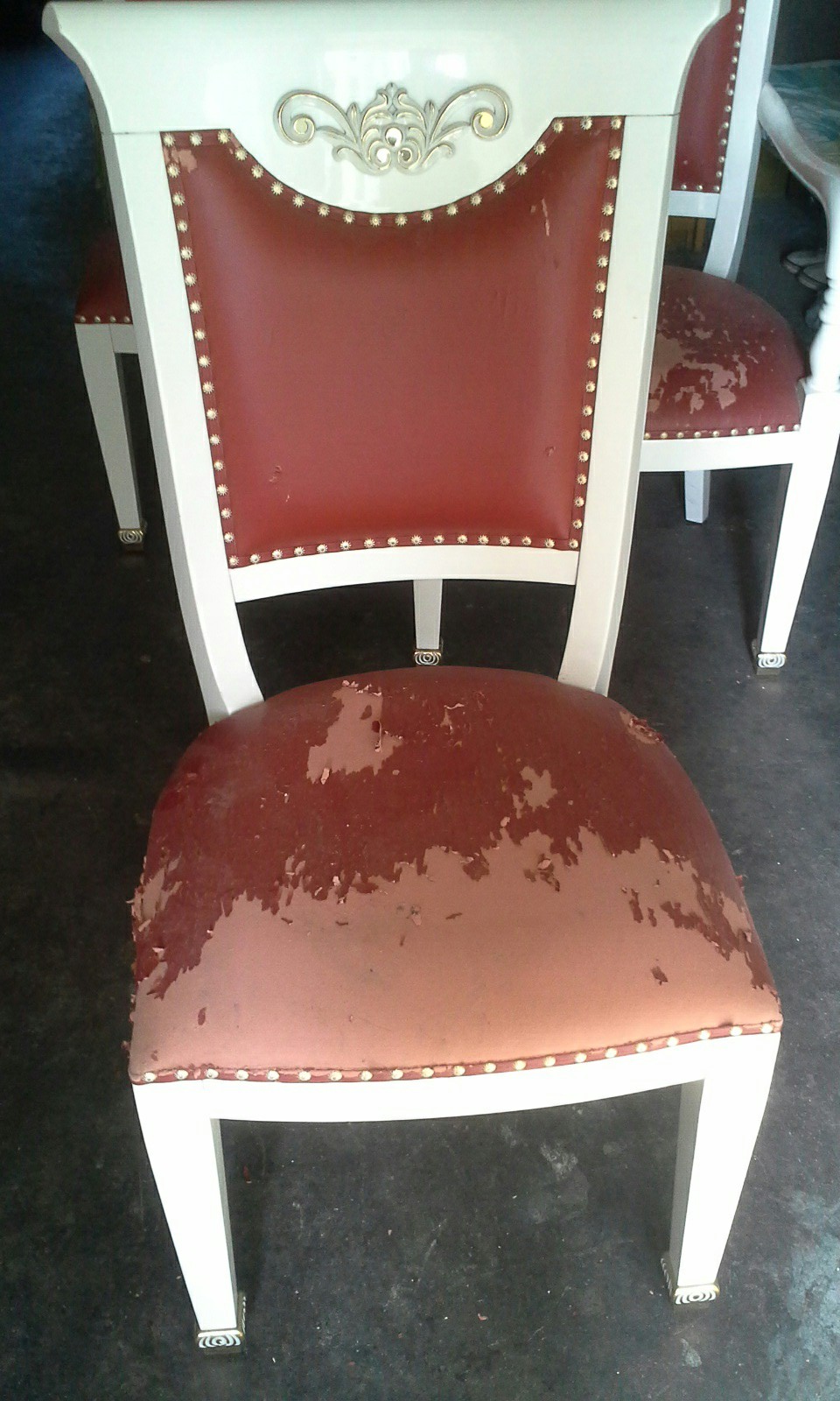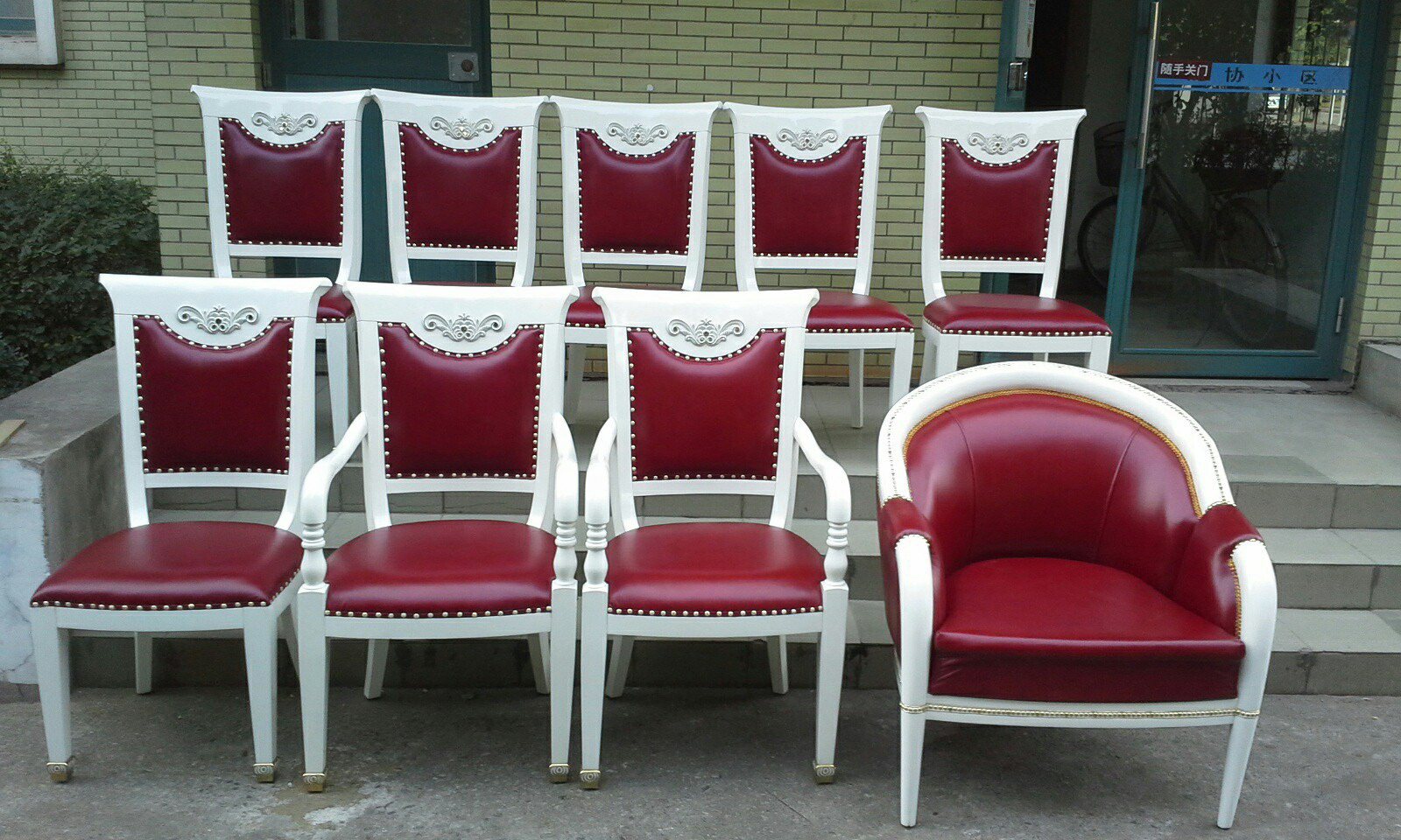 早期人造革餐椅,用了几年就脱皮了,框架很结实还是大品牌,只需要换皮就可以变新的了,还能配套使用,省钱省心。这款餐椅正面用牛皮,背面用人造革,只要600元一把,还不及新买的1/4的价格,使用寿命长达8到十年,超级划算。皮新彩服务热线135 8595 6565