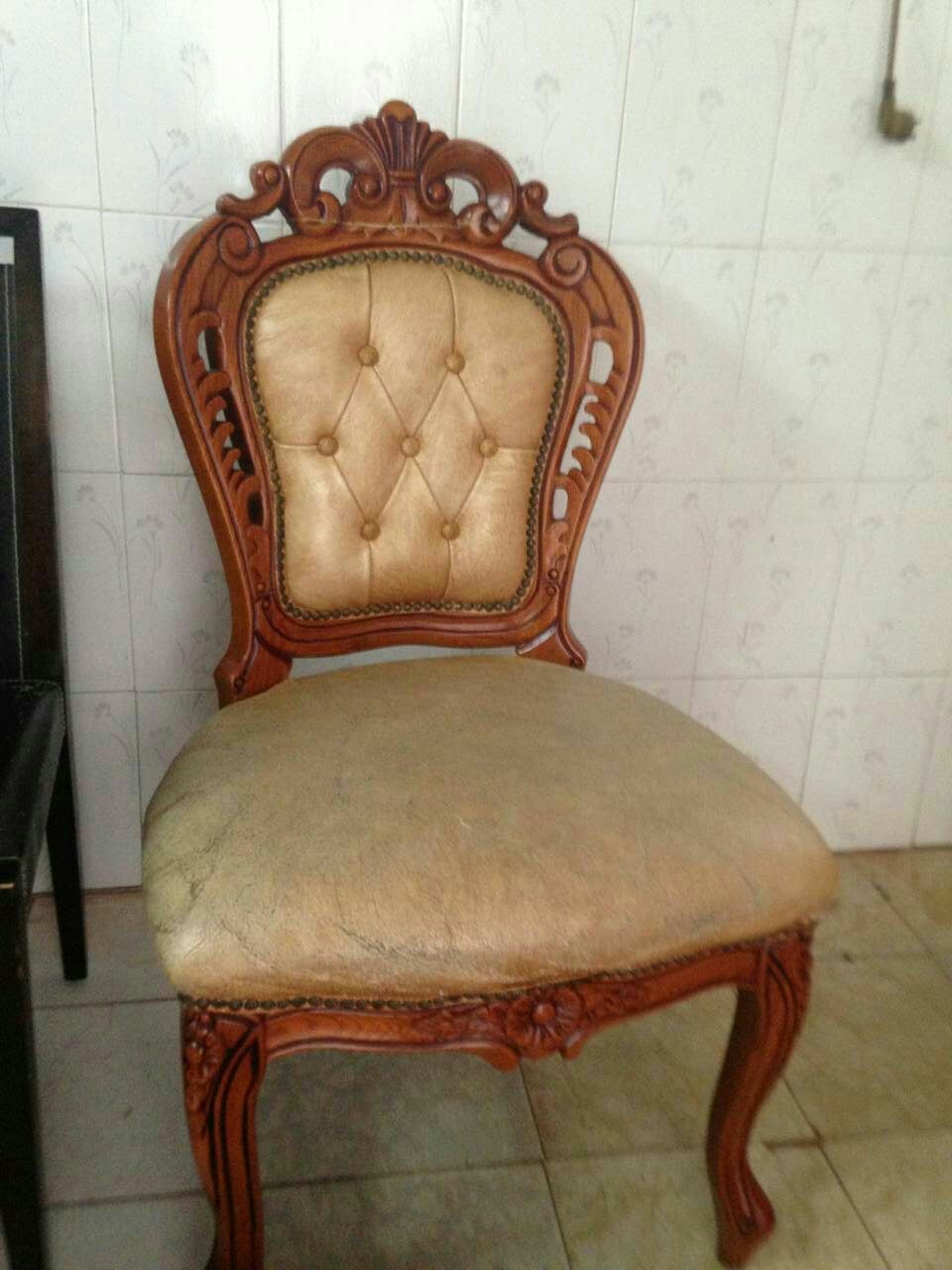 牛皮餐椅,用了13年皮面老化褪色磨损开裂了,实木雕花框架,有了皮新彩,旧的不去新的来。立马找回当年的新光彩,再战十年不是事。省钱省心。这款餐椅正面用牛皮,背面用人造革,只要700元一把,还不及新买的1/4的价格,皮新彩服务热线135 8595 6565