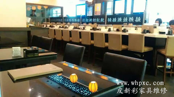 禾禄寿司日本料理餐厅,每家分店的椅子每年都由我们换面一次,保证了家具品质,换皮面比买新的要便宜80%,皮新彩餐厅家具维修热线:13585956565