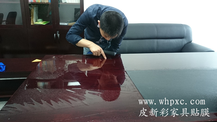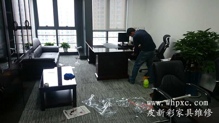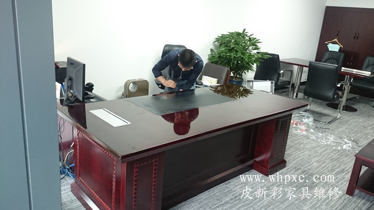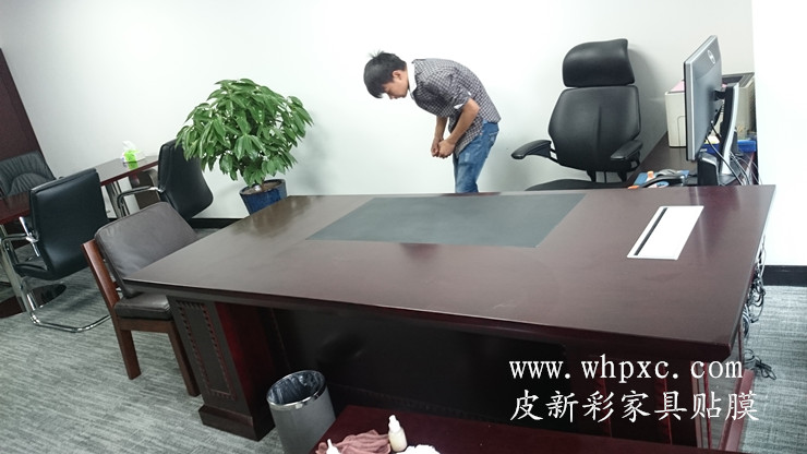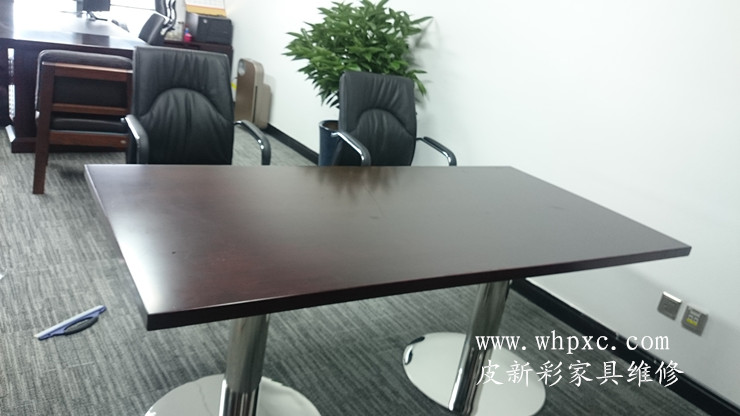 长江水利委员会家具贴膜维修工程,崭新的办公家具漆膜太薄,水杯一烫漆面就发白,做卫生水没有擦干净也发白,我们给出两种方案,贴膜和喷漆,还是贴膜效果好又环保,皮新彩办公家具维修13585956565