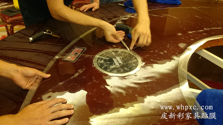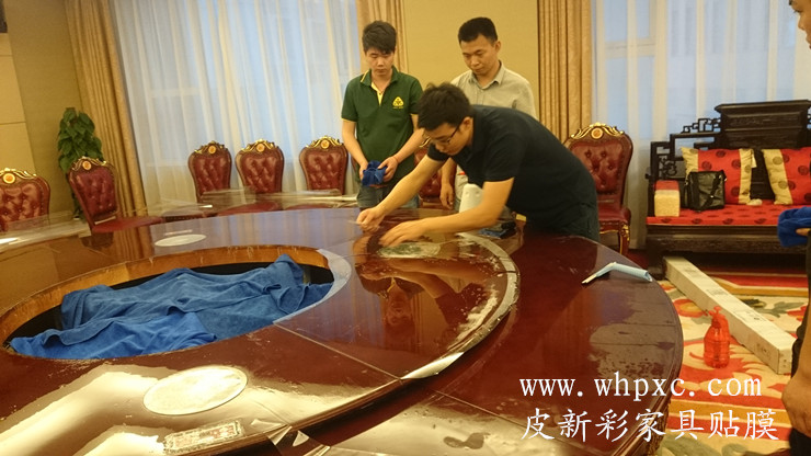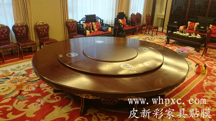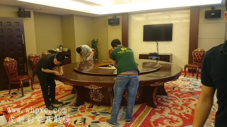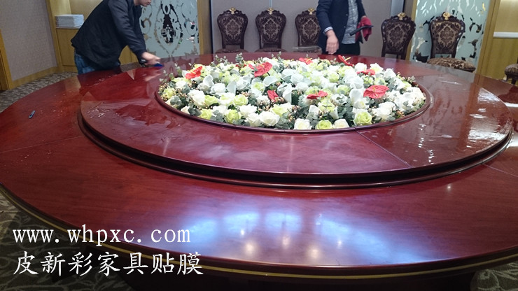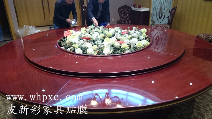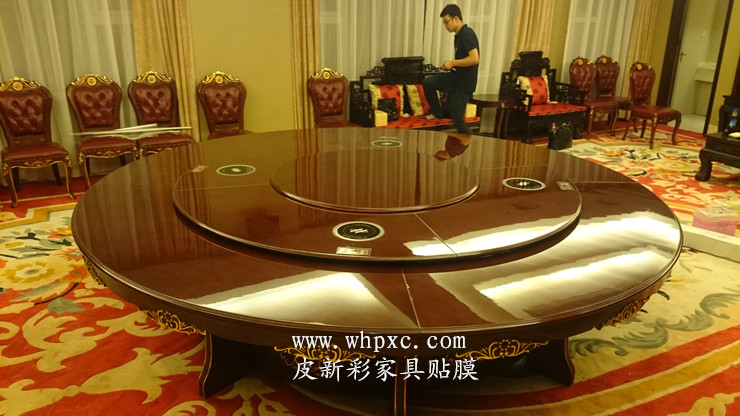 酒店餐台贴膜,酒店高档实木大餐台无法铺桌布,餐具摩擦又容易把漆面划伤,这种餐台用一段时间后就会出现烟头烫伤和划伤,我们把损坏部位修好以后再贴膜又像新的一样,皮新彩酒店家具贴膜电话:13585956565