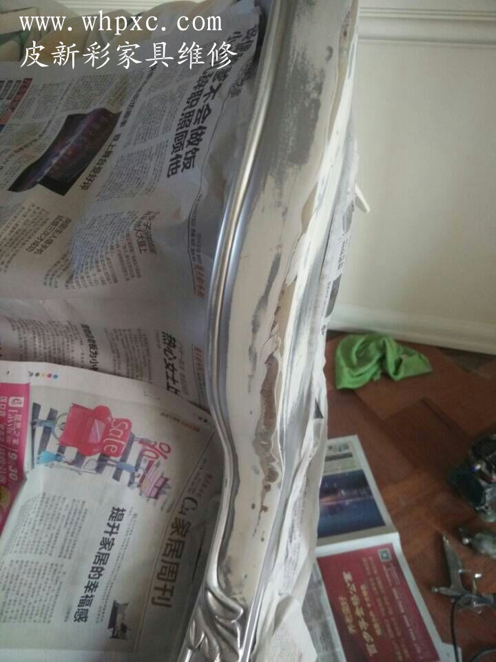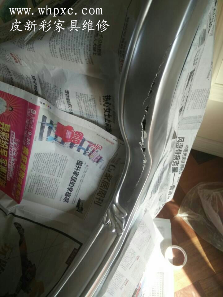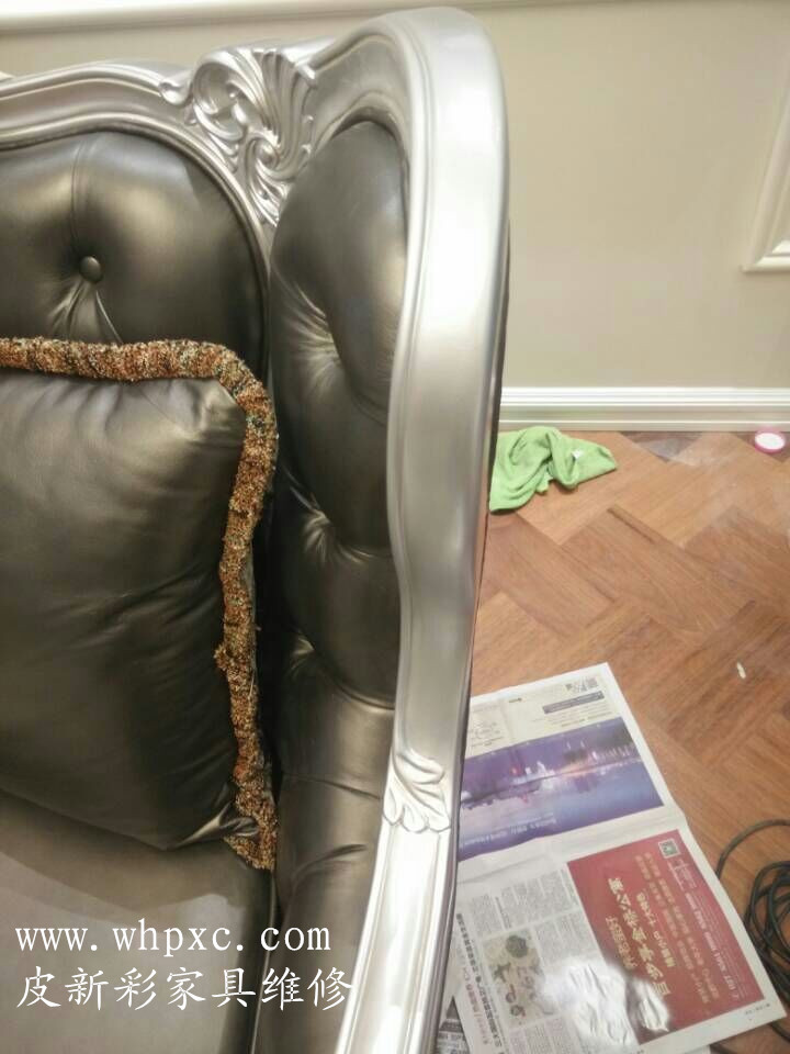 金属漆家具维修,这个欧式家具是树脂做的中看不中用,破损的地方居然是空的,我们用锯末和胶水把窟窿填平,然后打磨再调金属漆上色喷涂,修完之后几乎看不出来,其强度比原来更好。皮新彩家具维修热线13585956565
