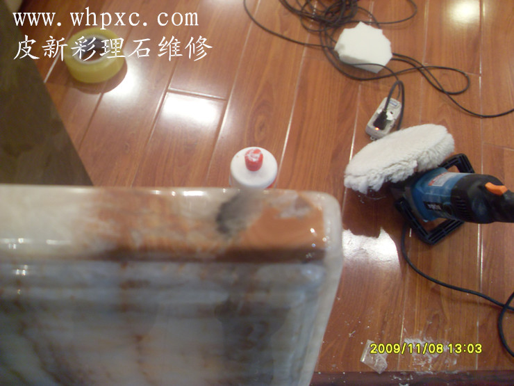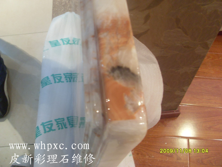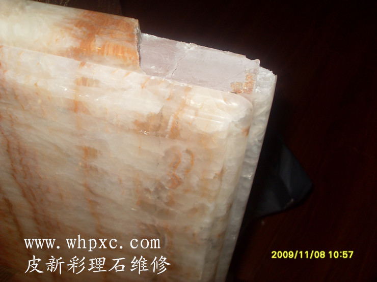 大理石维修,大理石边角最容易撞坏,用理石漆粘接起来,再打磨抛光就行,这种边角维修后一点都看不见,硬度和平整度也没有问题,皮新彩大理石维修13585956565