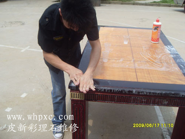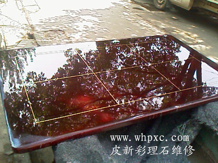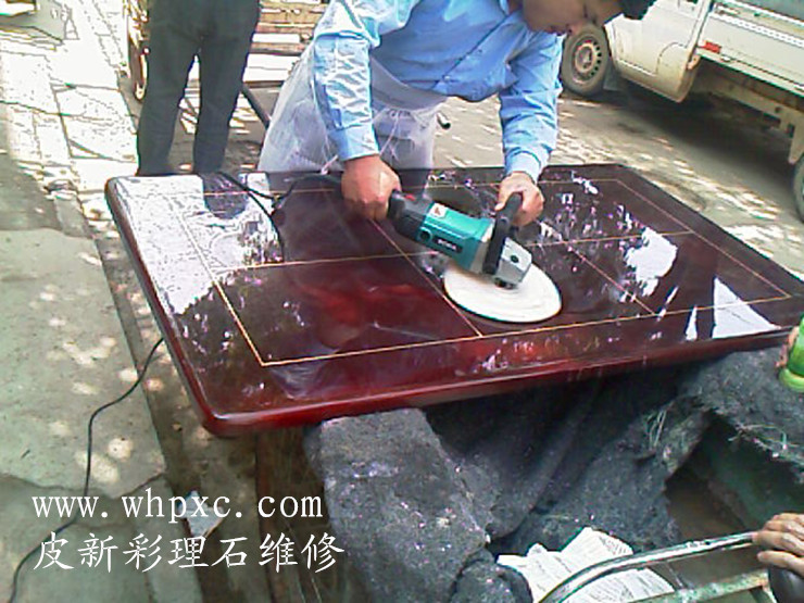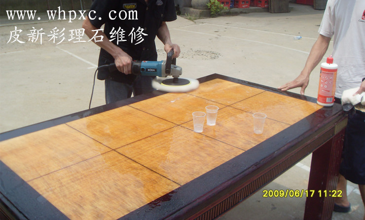 大理石维修,理石漆面容易划伤,划伤需要用600#粗砂纸打磨一遍,再用2000#号水磨砂纸加水打磨,最后用抛光蜡加水抛光,皮新彩大理石维修13585956565