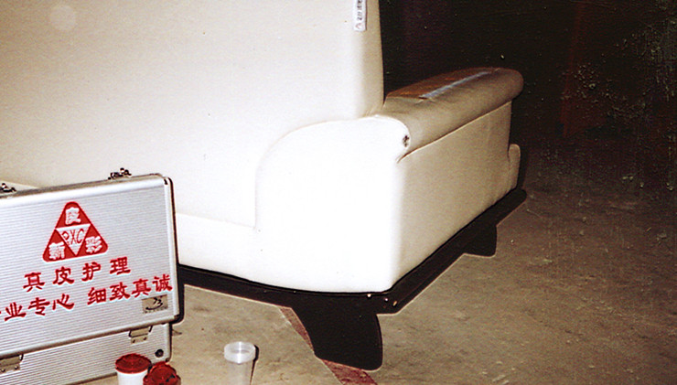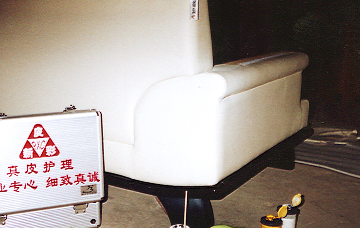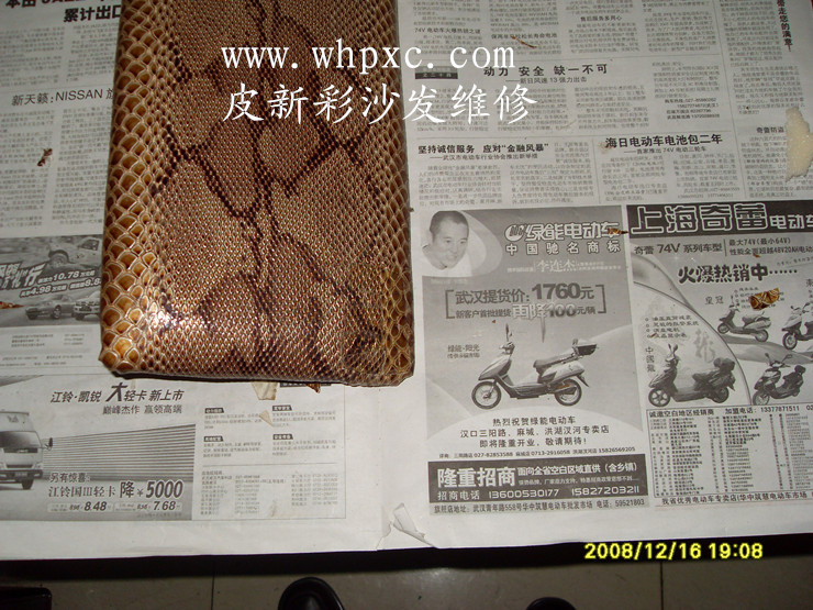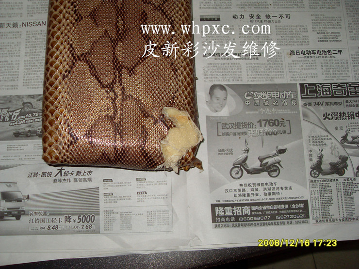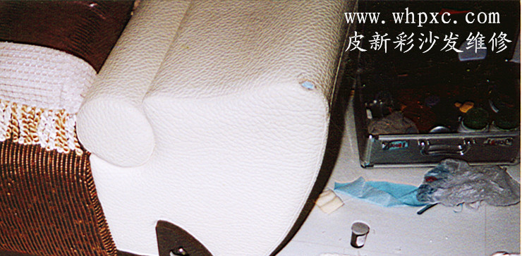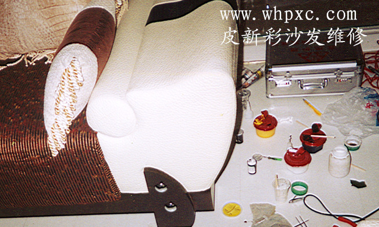 蛇皮沙发维修,这种破洞缺一块皮子,纹路及颜色不太好做,我们需要就地取材在沙发的里面或反面剪一块多余的皮子,再把他拼接上去,拼接伤口考验的是耐心和细心,拼接好了再上色修补,皮新彩沙发维修热线:135 8595 6565