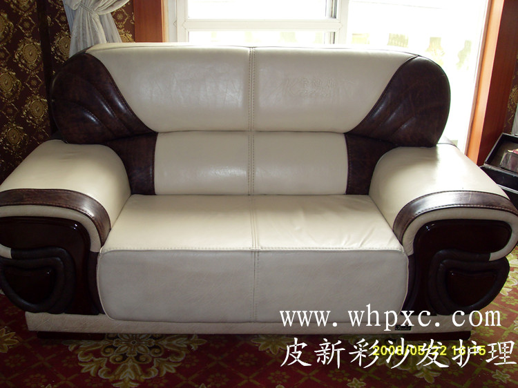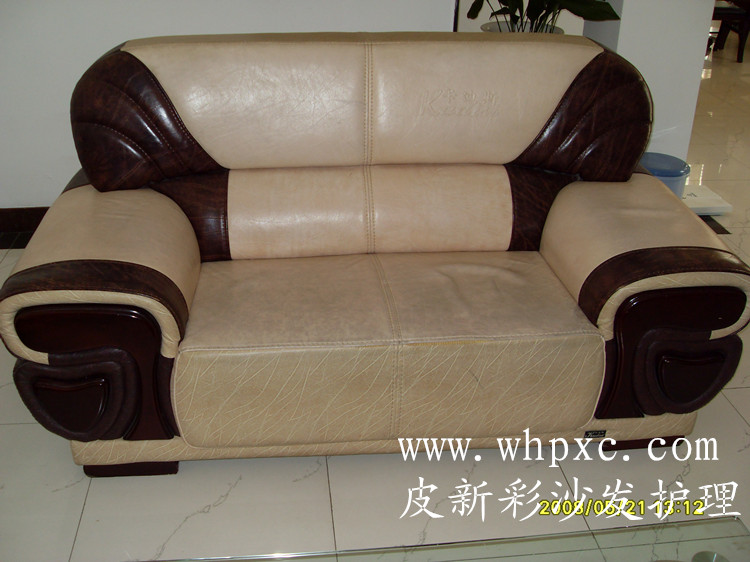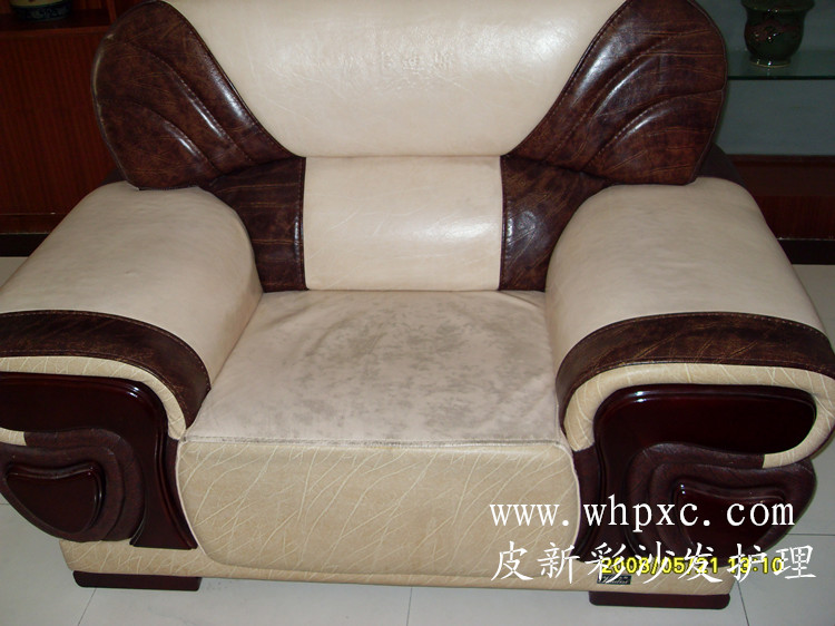 二层皮花纹厚皮发霉局部补色,全套清洗保养,沙发价值8000左右,属于贴膜二层皮用上3年左右容易炸裂脱皮,这套沙发还没有裂面,清洗保养费用为600左右。维修热线135 8595 6565